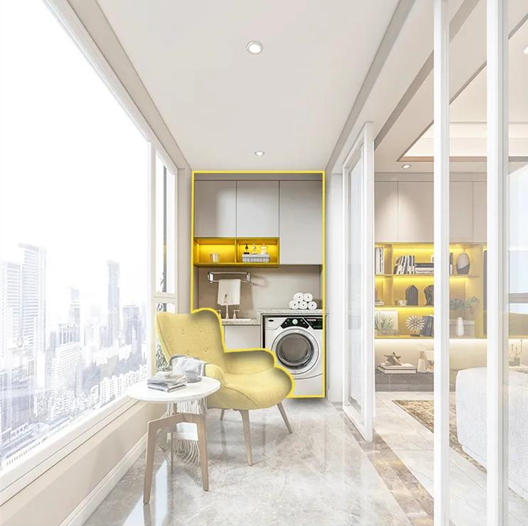 1、全屋采用潘通2021流行极致灰为主色,加以亮丽黄点缀,让居室更明亮;2、拆掉厨房门,让餐厨空间一体化,增加视觉通透感;4、采用全友绿色生态板,经美国NAF认证,安全又环保。整体以极致灰为主,加亮丽黄点缀,极具反差效果的颜色组合不仅可以提亮整个空间,还为居室带来活泼之感。整墙定制电视组合柜并内嵌电视机,合理利用每一寸空间,沙发背景墙也定制大量储物柜,增加收纳的同时还能满足展示,增加客厅的多功能用途。设计师拆掉厨房墙体,让餐厨一体化,空间利用率大大提高;餐椅坐垫、厨房瓷砖等以亮丽黄做点缀,让空间更温暖,让用餐更温馨。L型橱柜延伸出餐边组合柜,并且内嵌冰箱等小家电,整体效果更完整,右侧靠墙不规则吧台设计,摆上艺术品彰显主人生活品味。阳台作为客厅的延伸区,用透明玻璃门进行隔断,不阻挡日常采光,超大落地窗让视野更开阔,闲暇时刻一边看书一边赏景超惬意。生活阳台柜下方内嵌洗衣机,上方做吊柜,洗衣液、清洁工具都有处收纳,左侧洗手盆还能随手清洗小物,让阳台空间最大化。设计师将飘窗台面砸掉一半,摆上休闲椅便能成为舒适休闲区,角落放置画架,闲暇时刻静心画画,也不失为一种放松方式。半开放到顶式衣柜和床屏均以灰色为主基调,视觉上带来满满安全感,有利于屋主休息与安眠,衣柜居中开放格设计,方便拿取书籍资料。