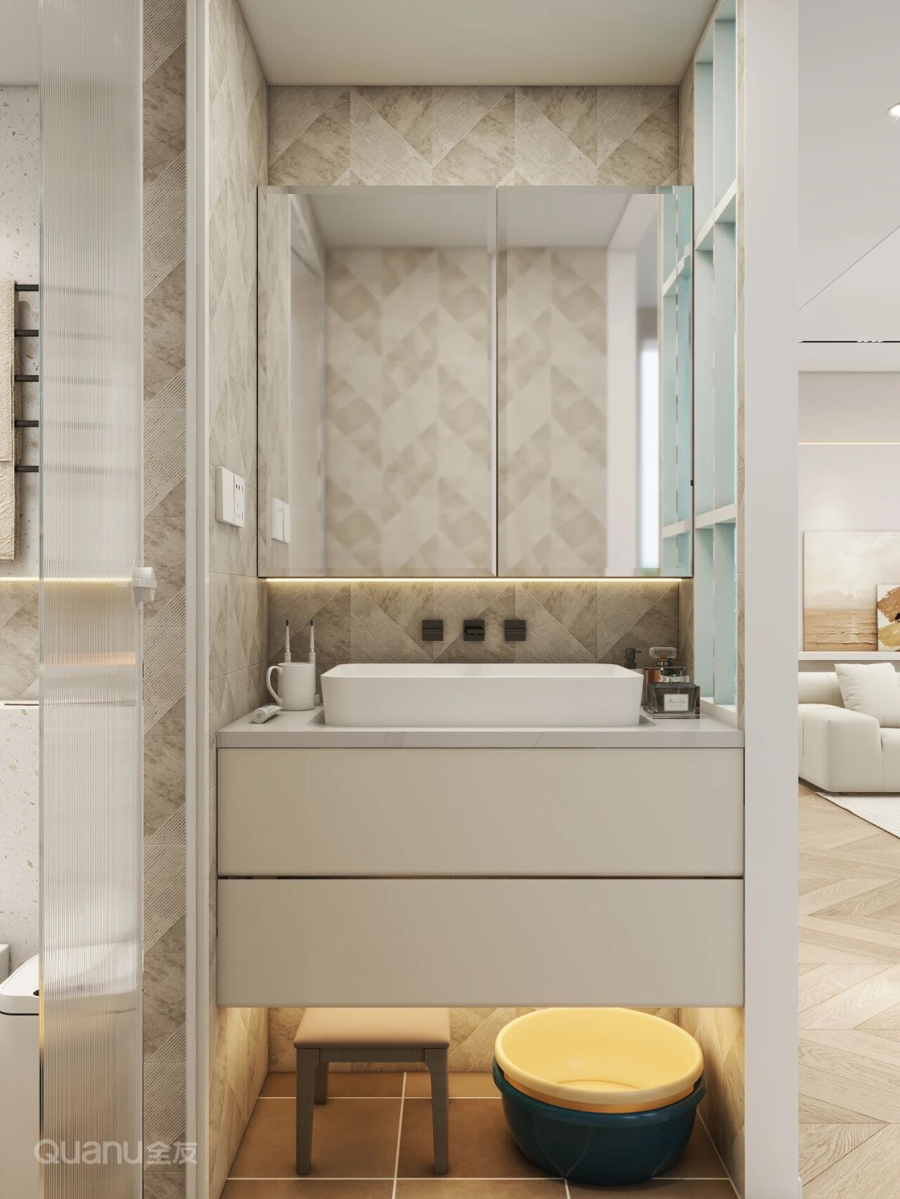 台盆柜可选用多层抽屉+悬浮设计,柜体底部离地约10cm,既能避免柜体受潮,又能扩大收纳空间;内部配置可调节层板,能够根据物品高度实现空间的自由分配。