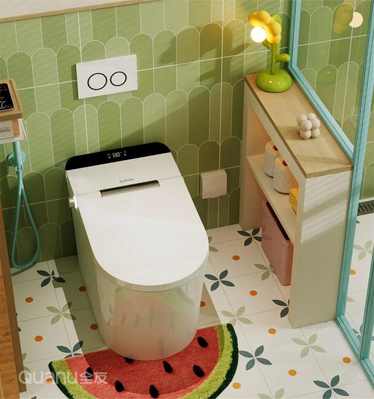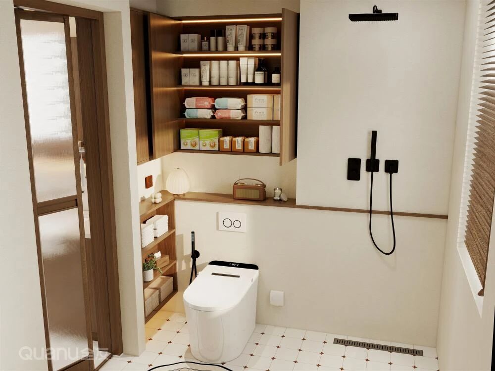 在马桶上方安装壁挂薄柜,深度约20cm,分层收纳纸巾和洗护用品,轻松利用垂直空间的同时,又能保持地面整洁。