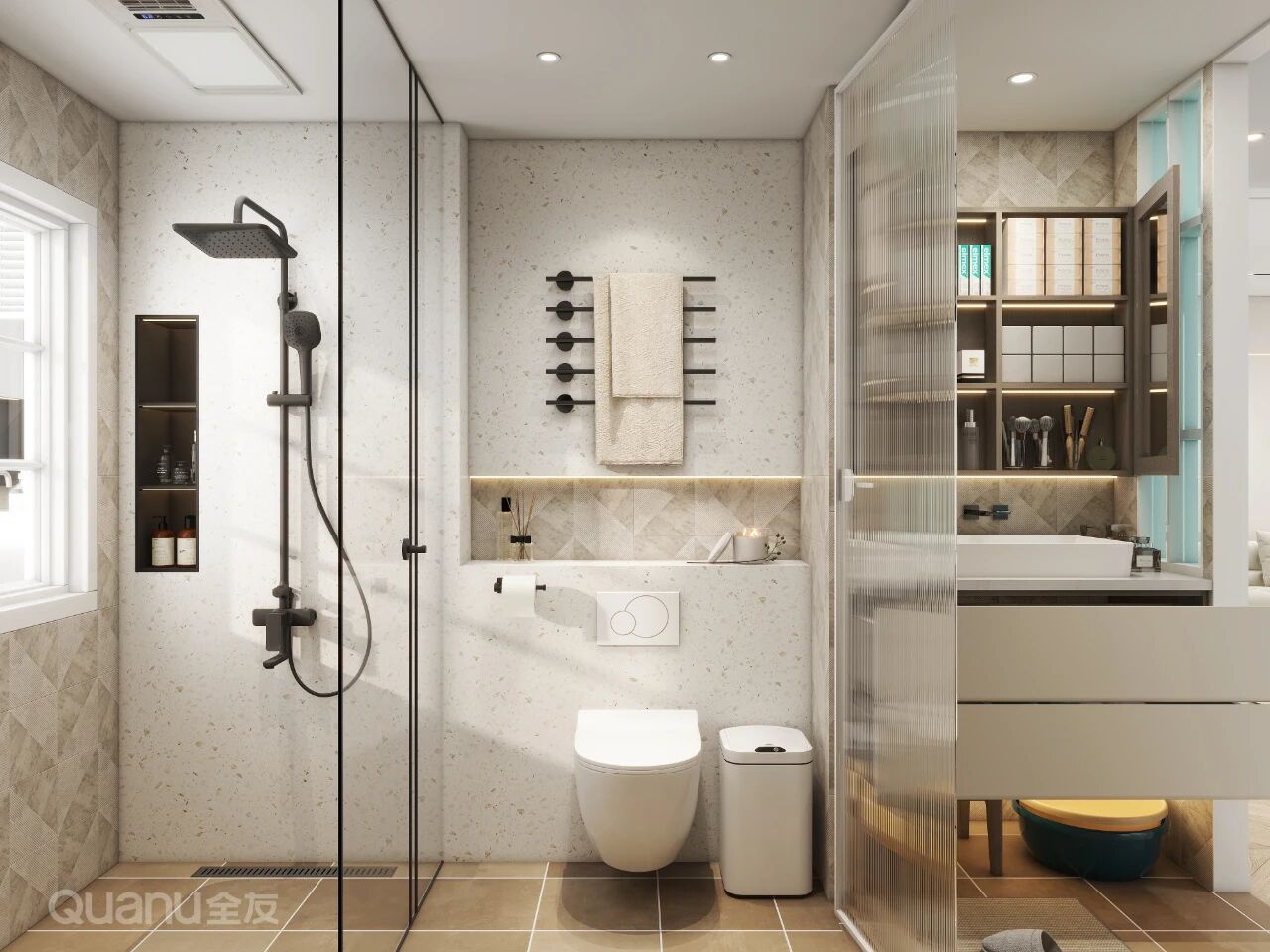 在马桶上方安装多杆分层毛巾架,浴巾、面巾、小方巾分区挂放,可避免交叉使用,还能保持干爽整洁。