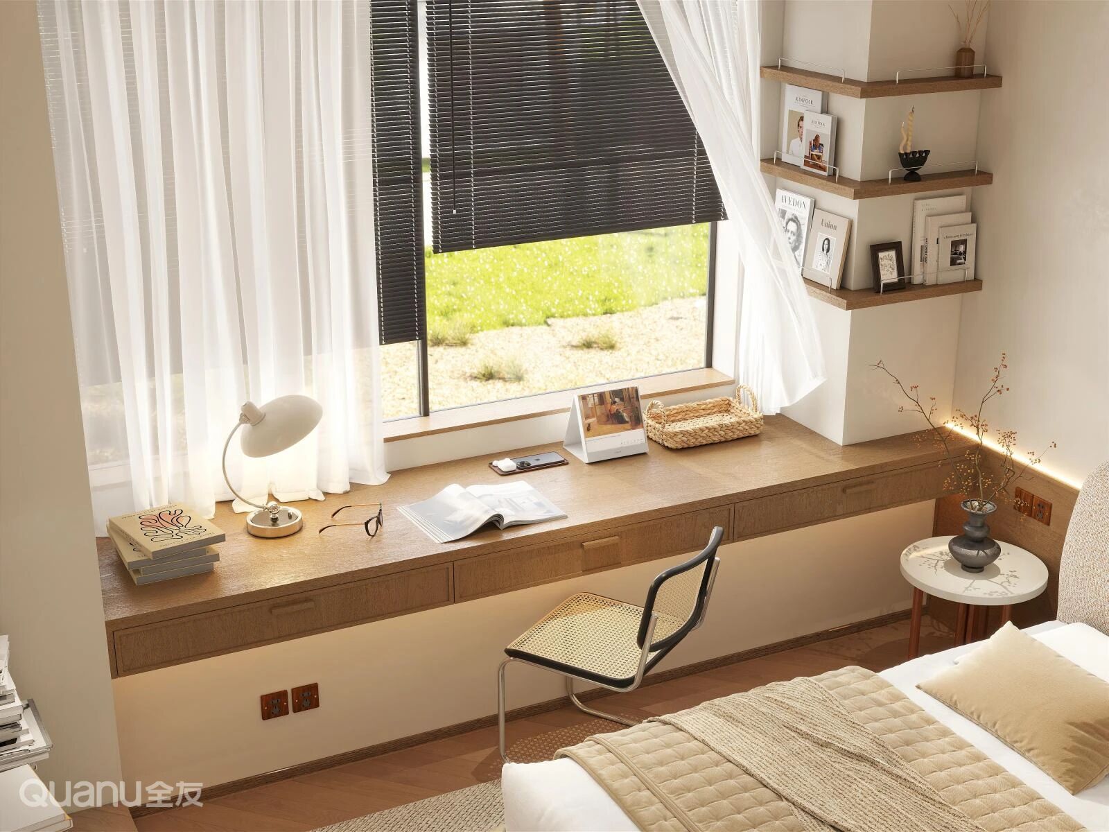 若飘窗不可拆,就直接在飘窗上叠加抽屉,将台面向外延伸20-35cm,桌底距离地面60cm,既满足物品收纳需求,还能用作书桌、妆台使用。