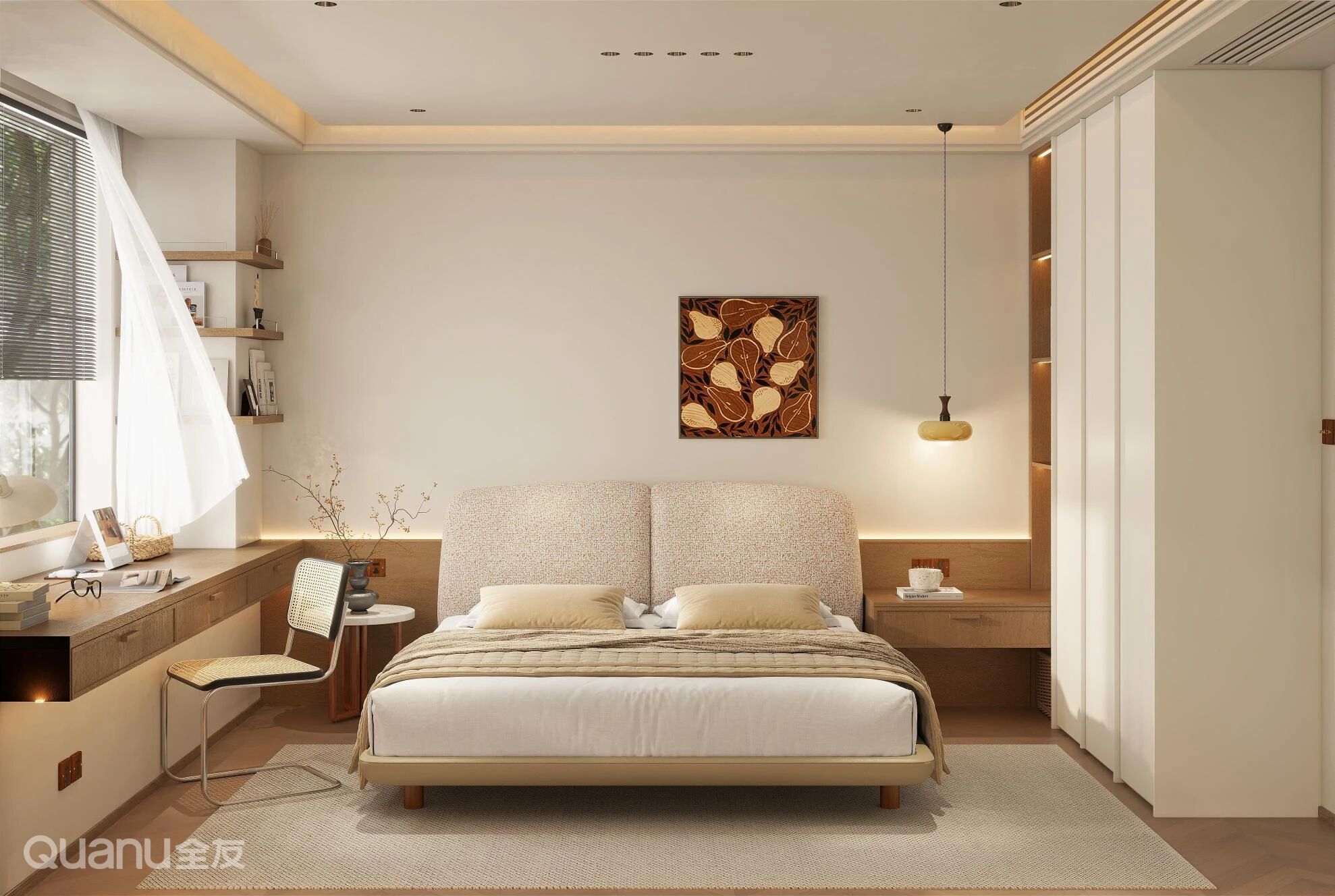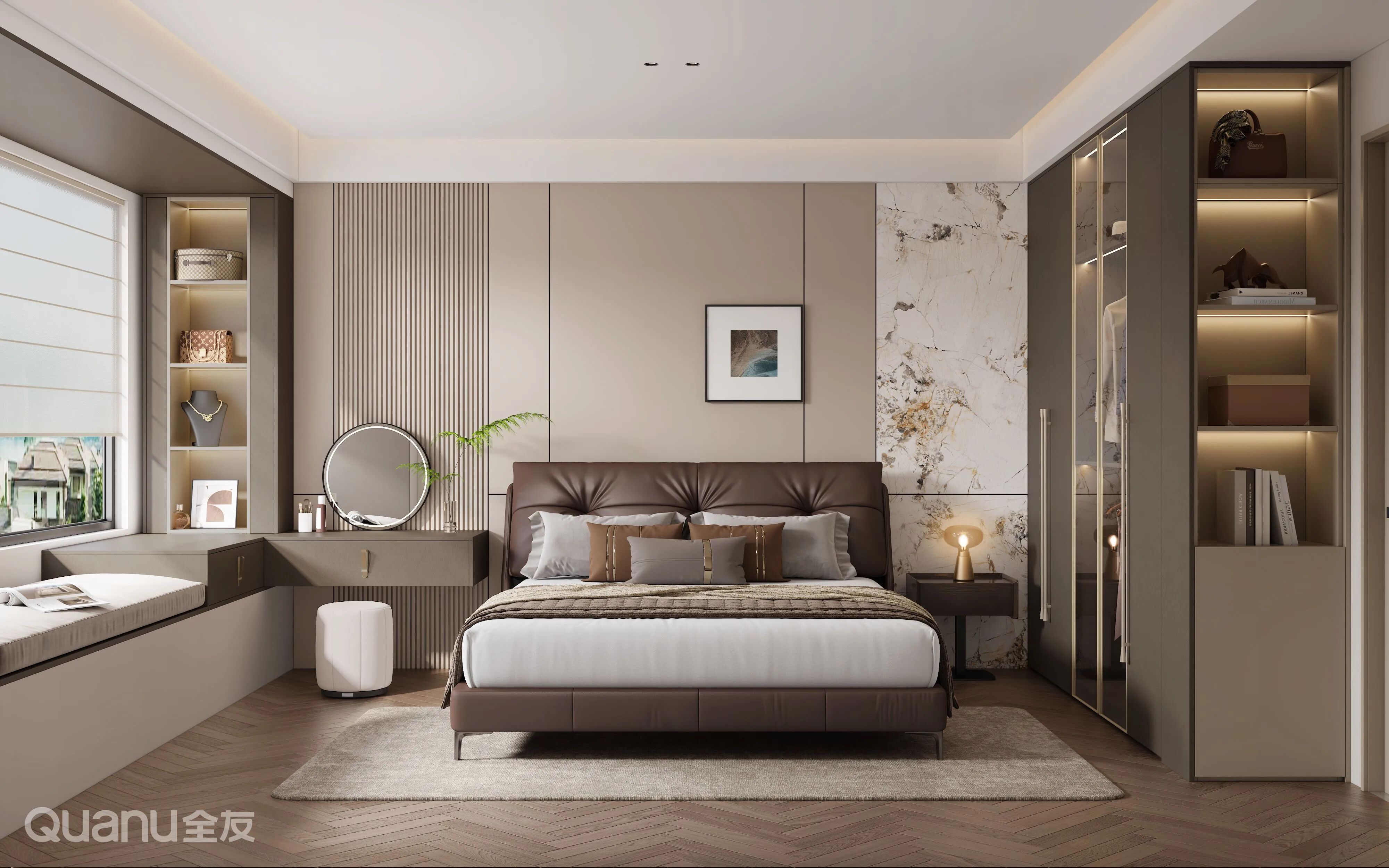 若飘窗下方是中空结构,建议将其改造成休闲卡座。台面铺上软垫作舒适阅读区,底部定制收纳柜,存放换季衣物、被褥等不常用物品,节省衣柜空间。