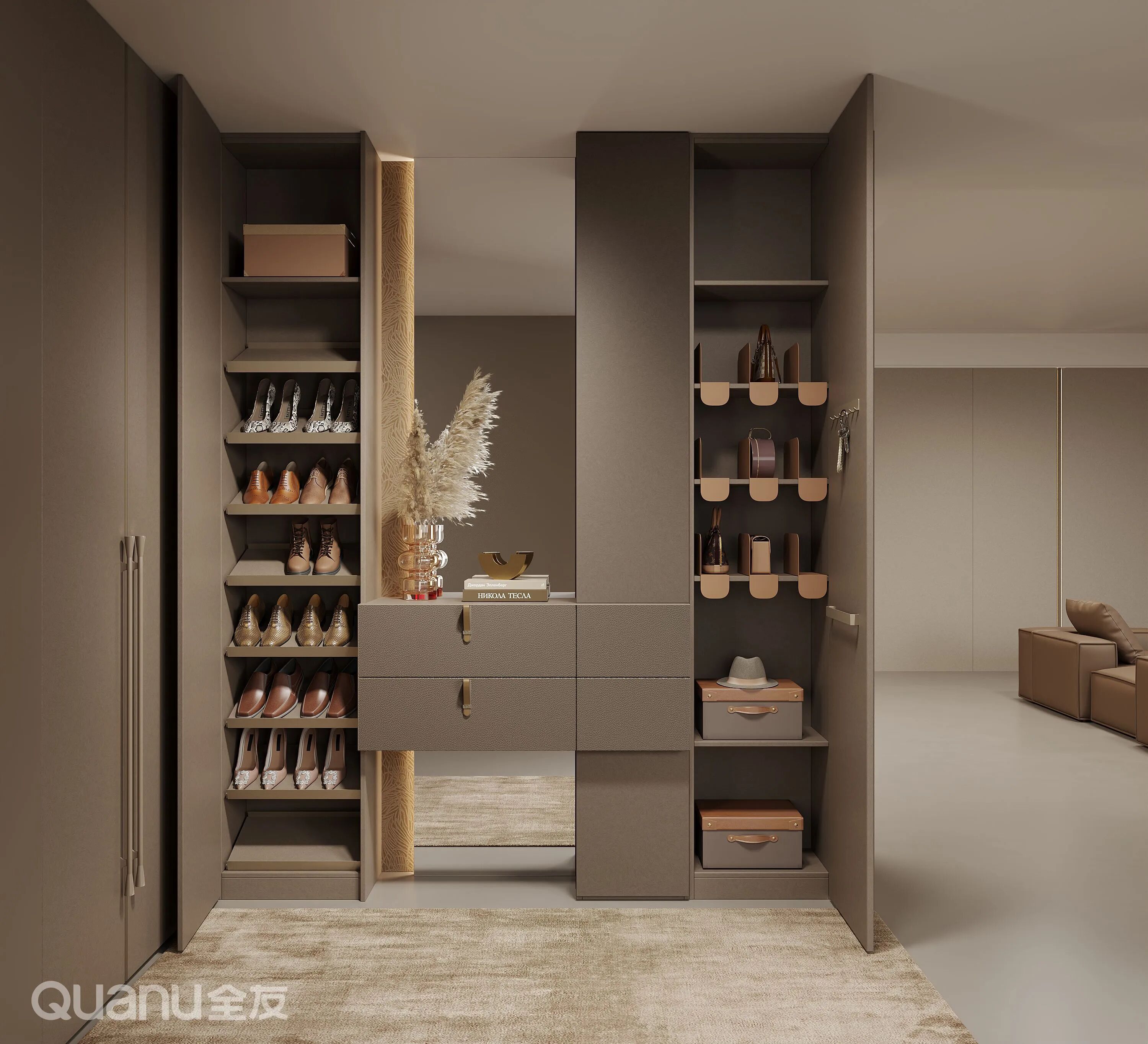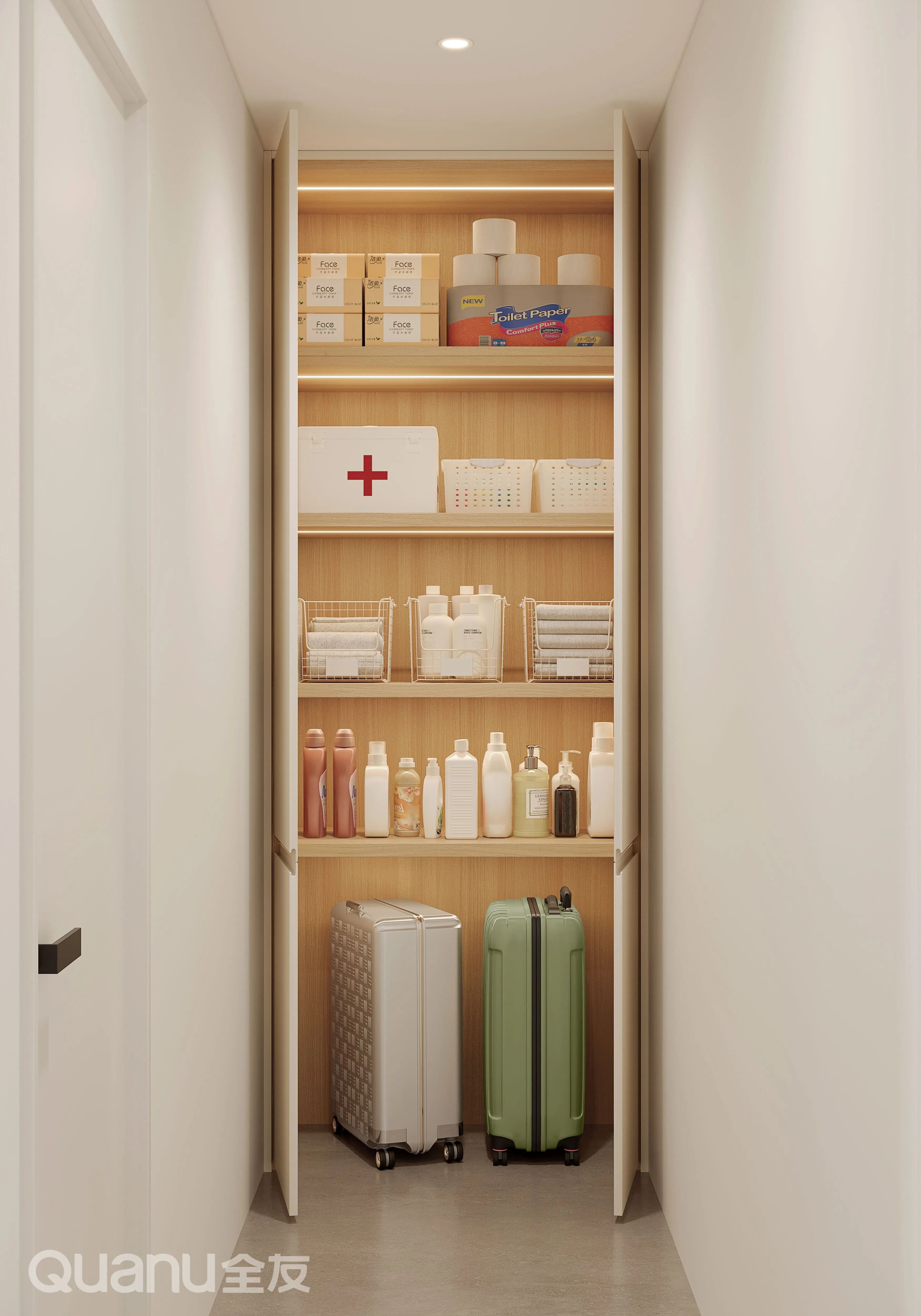 另外,还能在走廊尽头定制储物柜,内部用活动层板分隔,柜门一关,行李箱、修理工具、清洁用具统统完美隐形,干净整洁,空间利用率拉满。