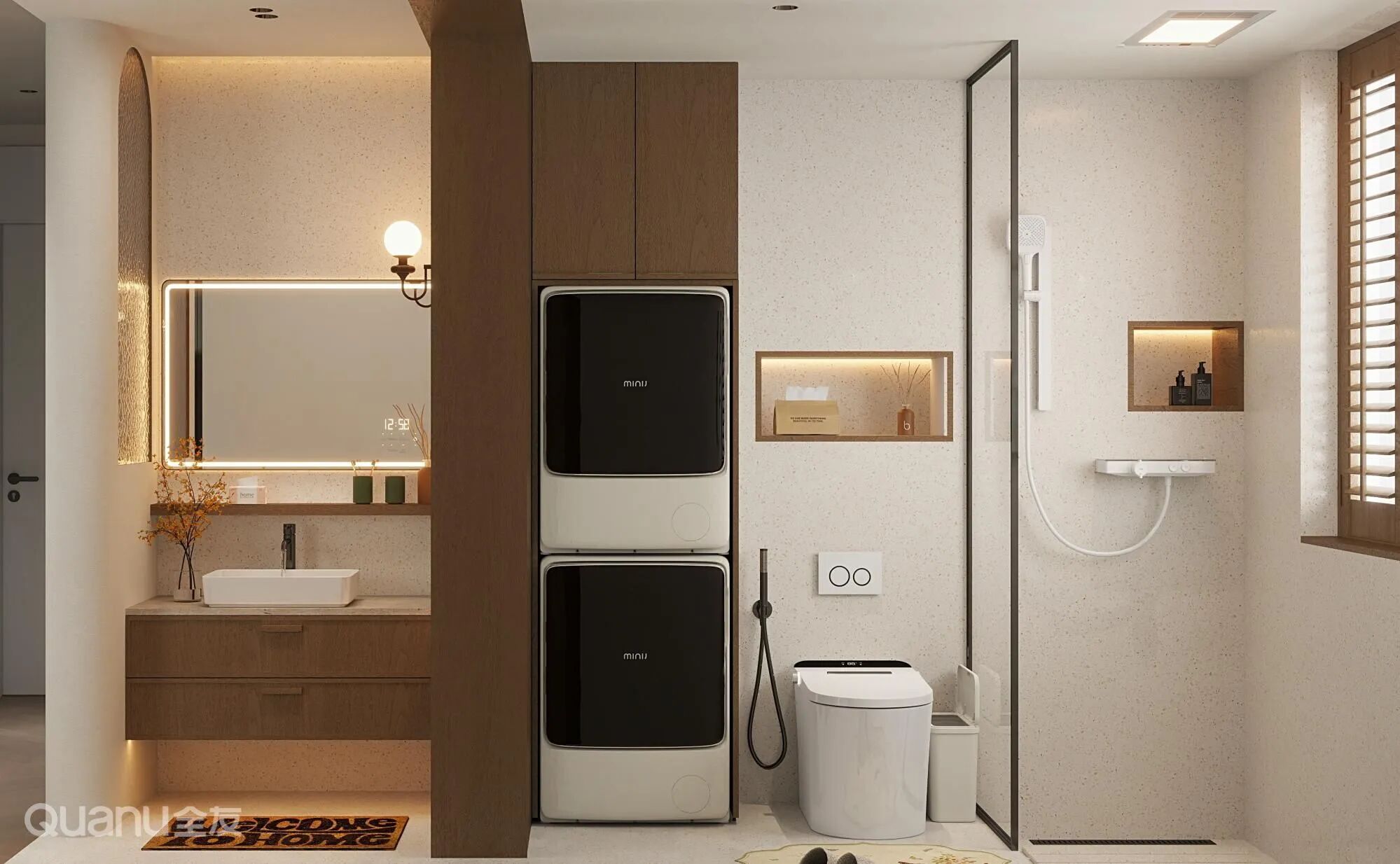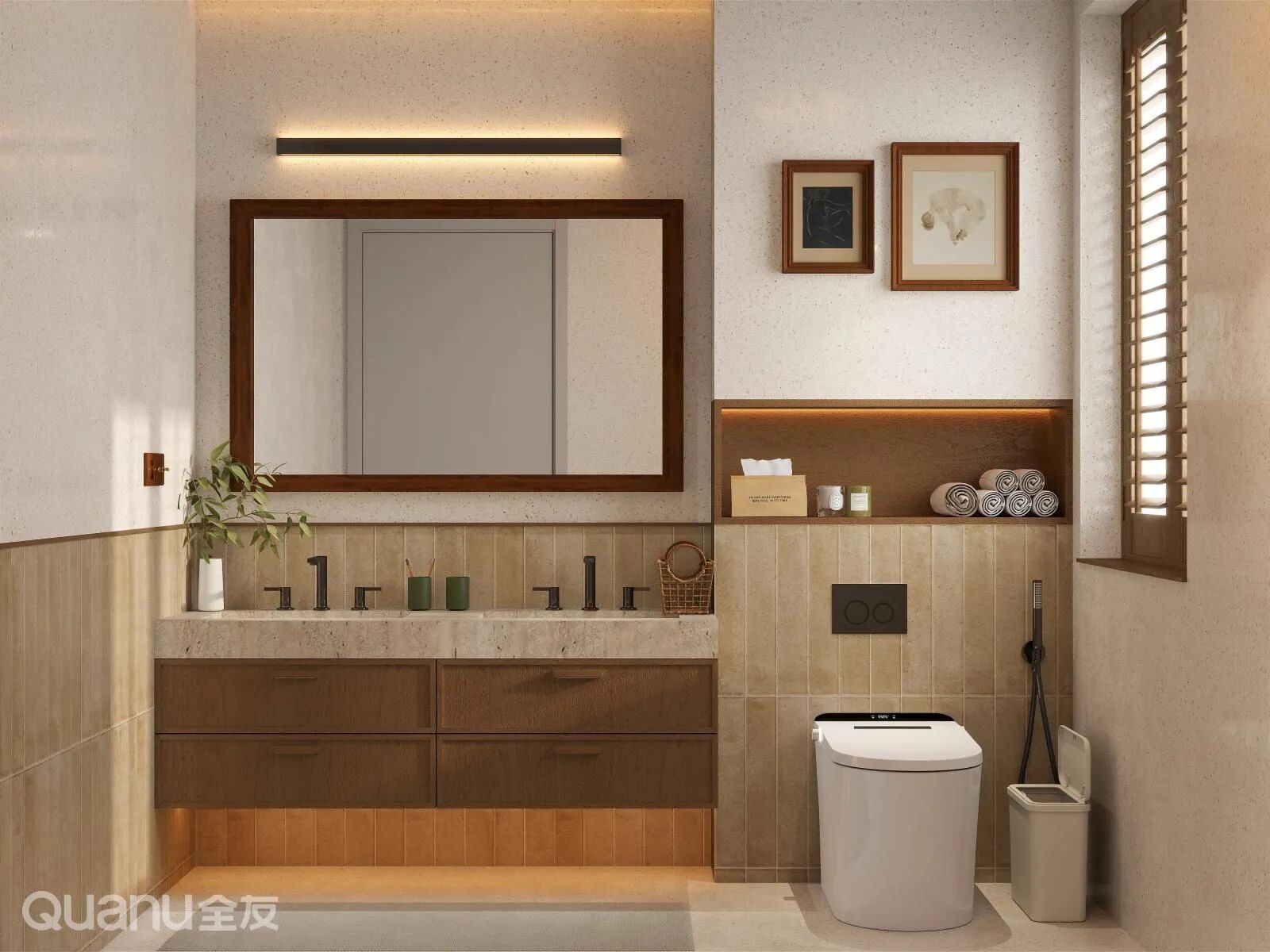 可以通过设计壁龛或直接安装壁挂式置物架,摆放洁厕用品、卫生纸、空气清新剂等,既方便取用又能提升空间格调。