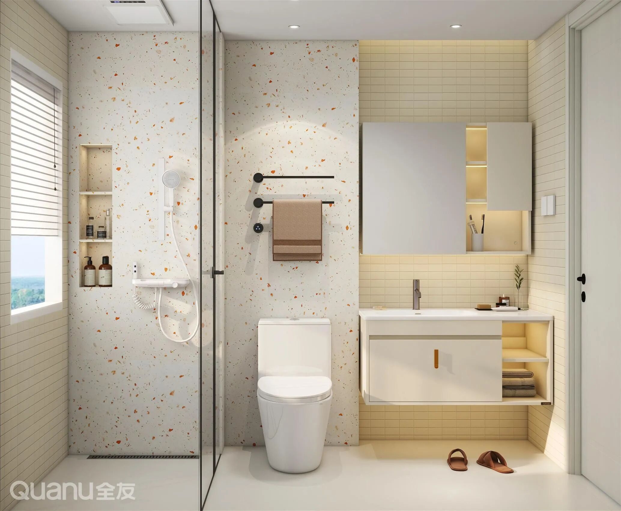 若空间允许,还可以在马桶上方安装窄吊柜,用于存放毛巾、浴巾和生活用品,让卫生间的收纳功能更加强大。