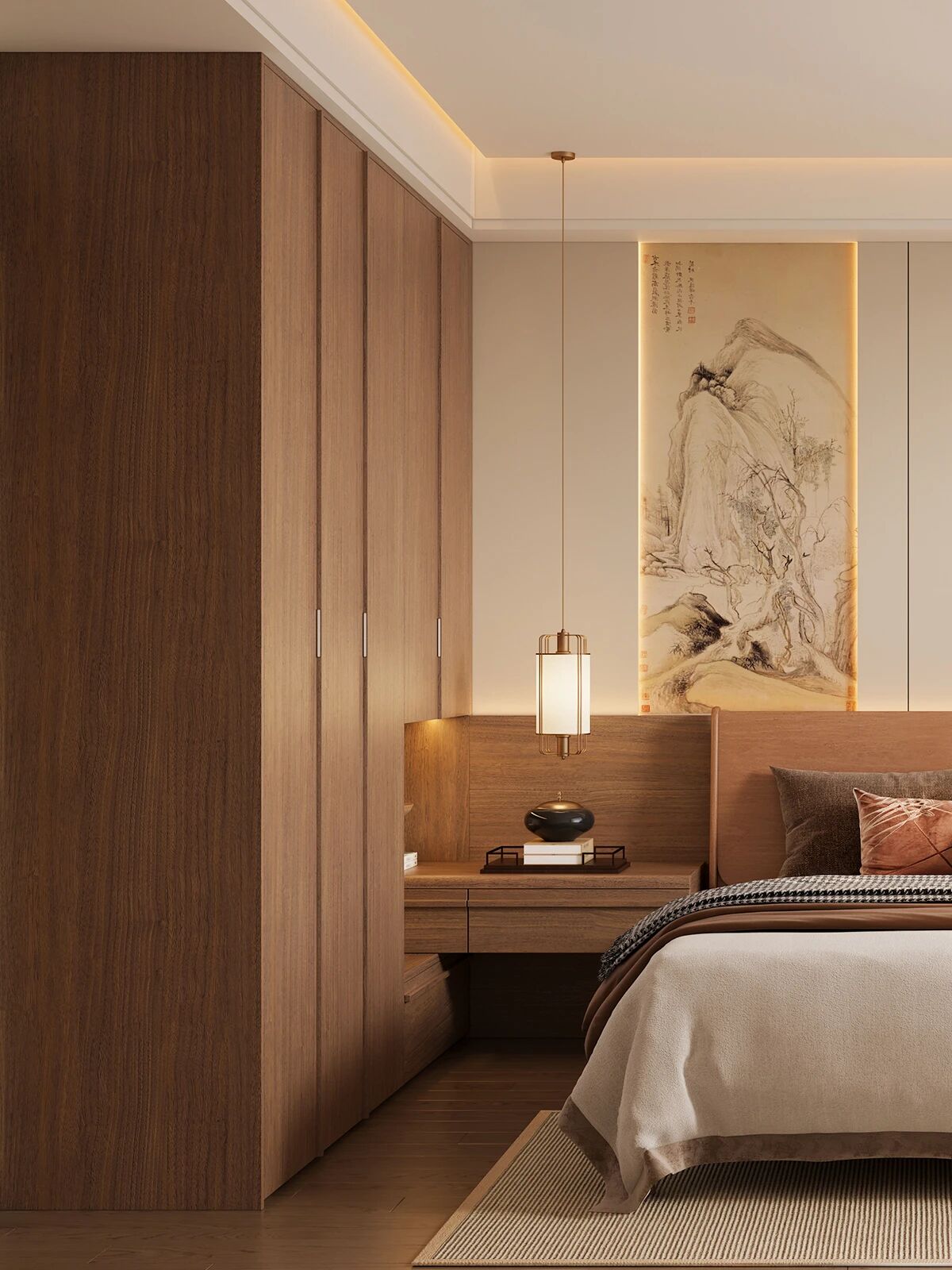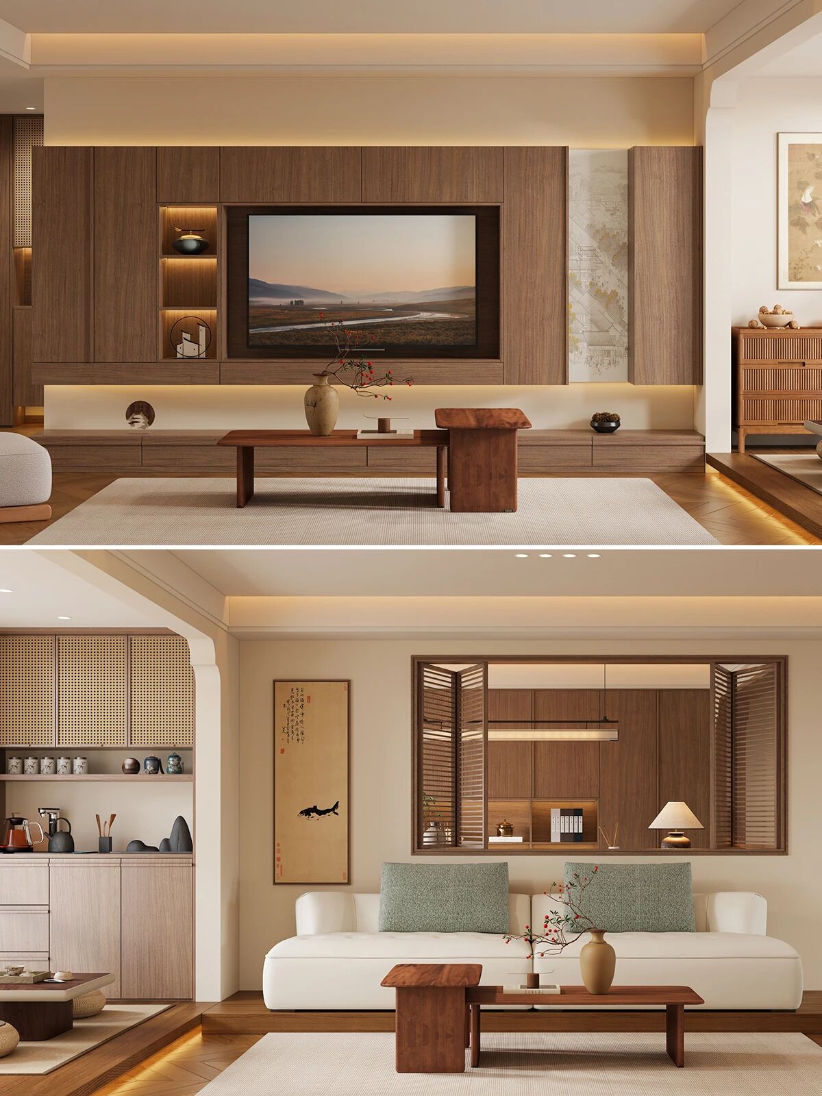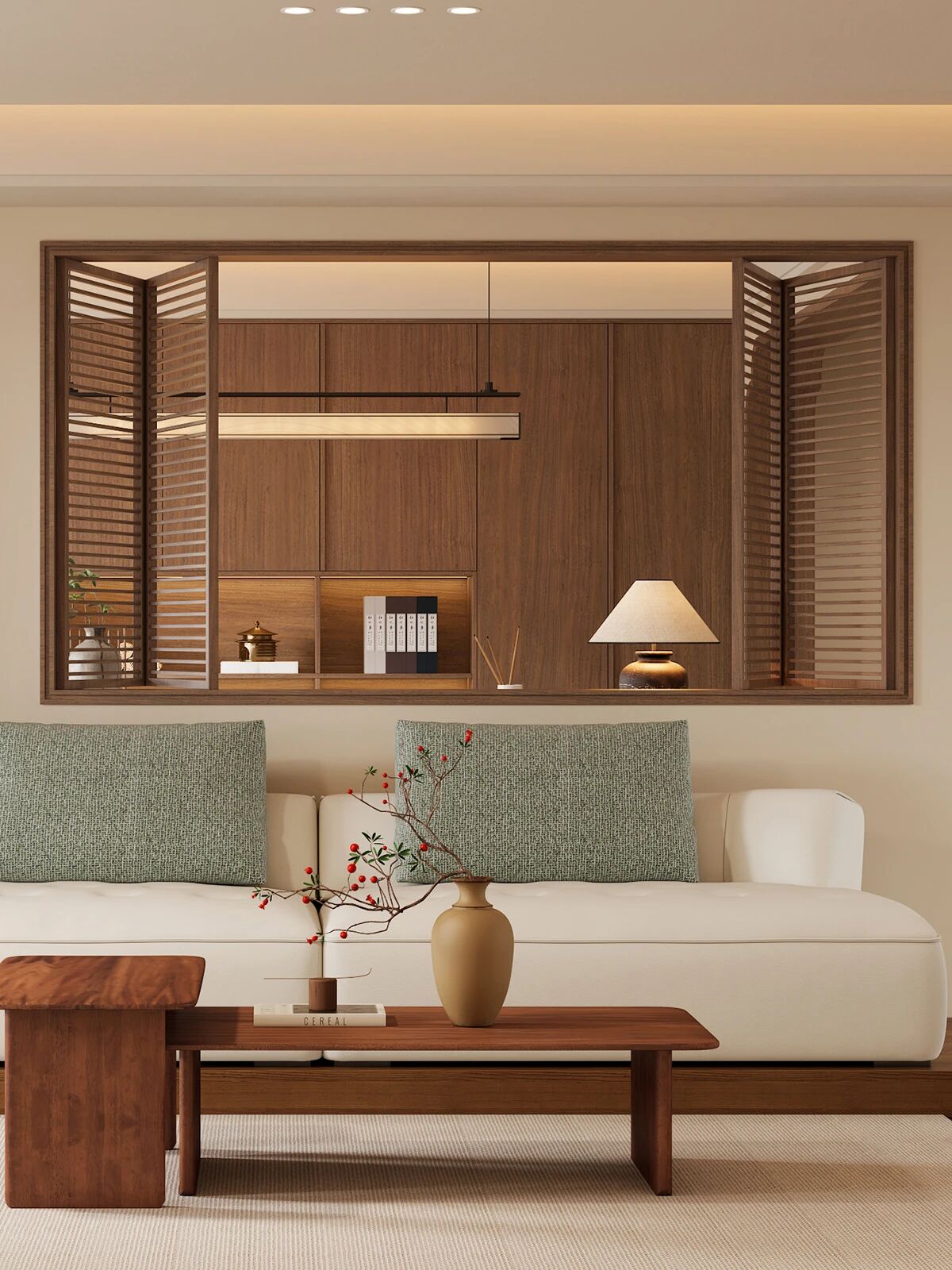 侘寂胡桃木纹🍂与留白墙面形成深浅对比