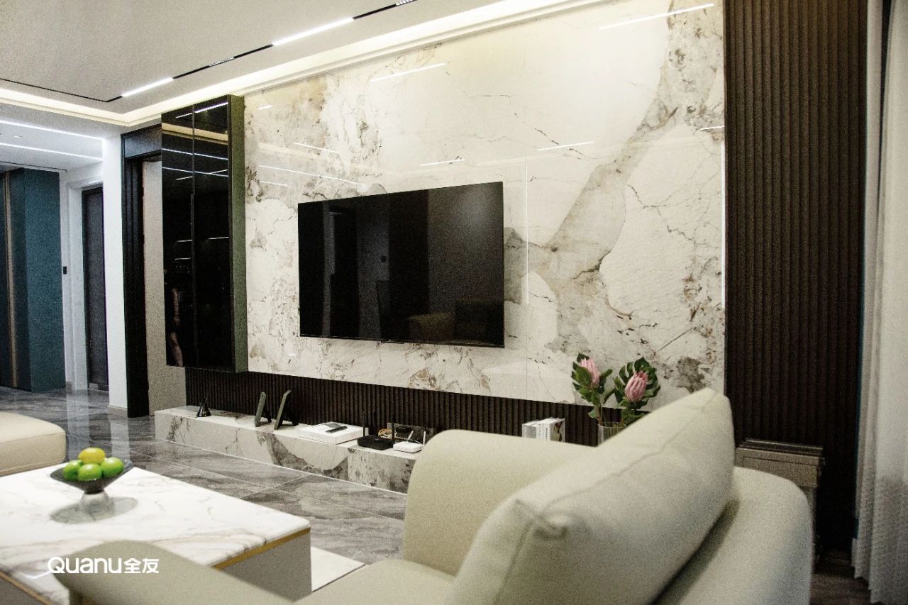 用岩板装饰电视背景墙,不仅防水防火防刮蹭,经久耐用易清洁,深浅交错的纹理还能带来艺术气息,让客厅空间更具有时尚氛围,适配多种装修风格。护墙板是一种以木质为基材的墙面装饰材料,最主要的作用就是保护墙面,它有着较高的抗压和抗折强度,具有耐磨、抗损、易清洁等优势,还有一定的保温和隔音效果。护墙板还具有优秀的装饰性,可供挑选的款式、种类非常多,可以根据不同的装修风格来搭配修饰,轻松提升电视墙的美观性和立体感。护墙板除了常见的平面板,还有富有层次感的栅格设计。栅格板可以通过栅格条粗细、造型、颜色的改变设计出各种形式,不仅弥补了墙面的空旷感,与其它材料搭配使用,还能赋予空间不同的气质。栅格板+定制柜装饰电视墙,可以同时满足高颜值和实用性的双重需求,搭配灯带还能带来灵动轻盈的视觉感受,在无形中提升空间档次。为了让客厅保持干净整洁,大部分家庭会选择定制整墙电视柜来收纳杂物。在中部预留出电视机的位置,周围定制柜体,形成“C”字或“回”字。为了减少了大面积柜体带来的“拥堵感”,一般还会设计几个开放格做展示区,达到“藏八露二”的收纳原则和视觉美感。